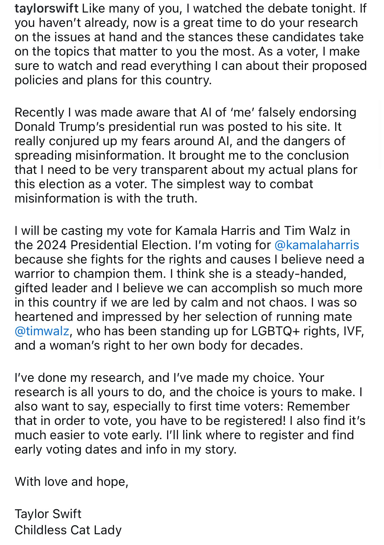 Last night (I regret to inform you that I’m writing this a day late) I treated myself to two delicious Eggplant Katsu Burgers. I needed something hearty for the evening ahead - I was gearing up for a day-late viewing of the Harris vs. Trump Presidential Debate. Nothing more to be said about this except that during both commercial breaks, pauses which strangely contained no commercials, I scrolled through Instagram and ate a bar of chocolate. It was in these minutes that I came across Taylor Swift’s endorsement of Kamala Harris and Tim Walz: